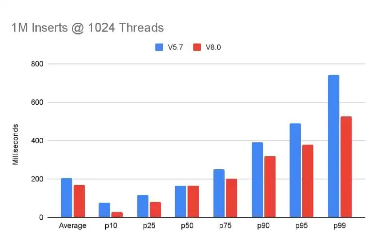使用1024个线程100万次插入操作,P99延迟降低29%: