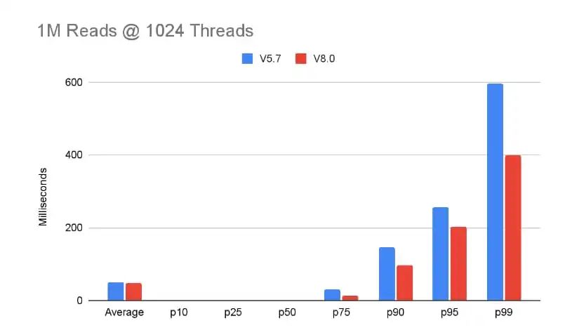 使用1024个线程100万次读操作,P99延迟降低33%: