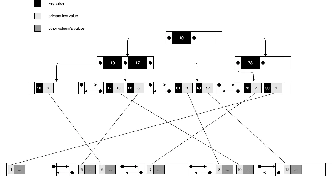 secondary index查询后还要根据clustered key去拿最后的数据 secondary index range query的时候,拿数据的时候因为clustered key不确定(page不确定,且要最终排序),所以性能没有clustered index好 secondary index会包含clustered key,如果clustered key值比较大,第二索引也会比较大 如果sql语句被secondary index覆盖,就不用去拿实际的数据,直接从叶子节点获取就行,性能比较好