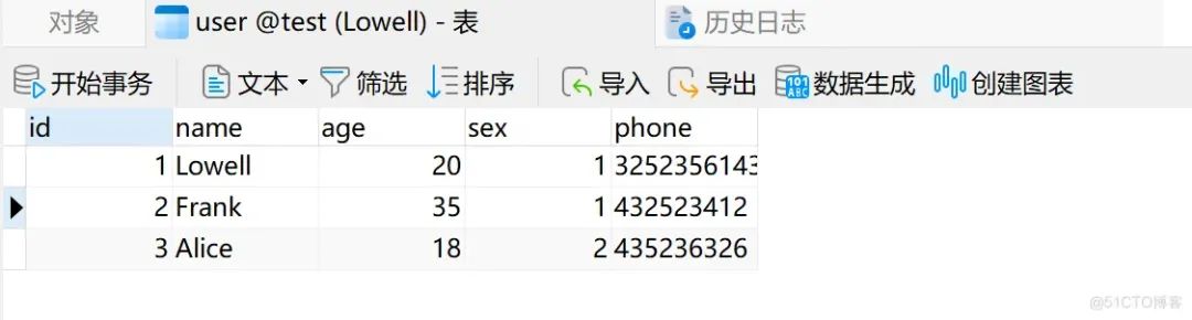 ,并插入几条数据,推荐使用 Navicat等图形化管理工具,不用麻烦地在 MySQL 命令行写SQL语句。表如下: