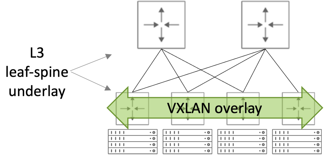 VXLAN技术将已有的三层网络作为Underlay网络,在其上构建出虚拟的二层网络,即Overlay网络。Overlay网络通过封装技术、利用Underlay网络提供的三层转发路径,实现租户二层报文跨越三层网络在不同站点间传递。对于租户来说,Underlay网络是透明的,同一租户的不同站点就像工作在一个局域网中。构成数据中心架构的基础设施,比如数据中心交换机,基本上都有VXLAN虚拟协议,可以实现数据虚拟化。虽然 VXLAN 只是众多虚拟网络或隧道技术中的一种,但它比其他技术更好地解决了数据中心网络中的几个扩展挑战。由于这些优势,用于云计算的现代数据中心网络架构通常将基于稳健路由协议(例如BGP)的“scale-out”IP (L3) leaf-spine Underlay与基于 VXLAN 的Overlay相结合,如下图所示。| L3 Underlay和VXLAN Overlay的可扩展数据中心架构1. 虚拟机发送数据包到虚拟网络。
