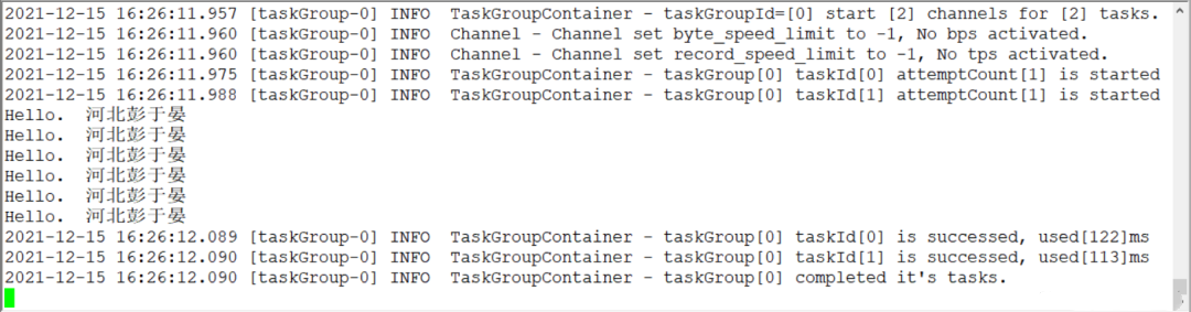 2021-12-13 19:26:28.829 [job-0] INFO StandAloneJobContainerCommunicator - Total 100000 records, 2600000 bytes | Speed 253.91KB/s, 10000 records/s | Error 0 records, 0 bytes | All Task WaitWriterTime 0.060s | All Task WaitReaderTime 0.068s | Percentage 100.00%