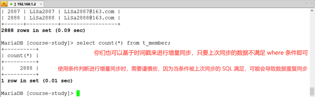上面的方式相当于是完全同步,但是当数据量较大时,同步的时候被中断,是件很痛苦的事情; 所以在有些情况下,增量同步还是蛮重要的。