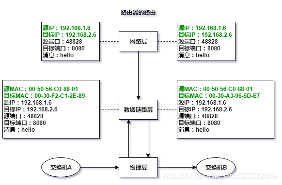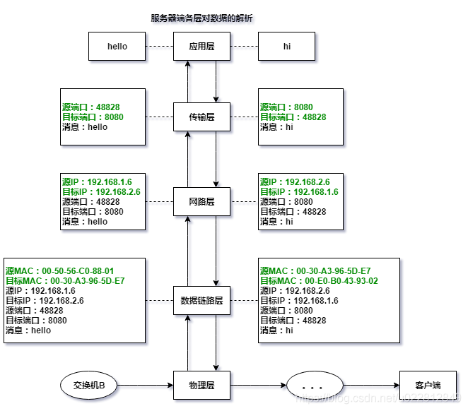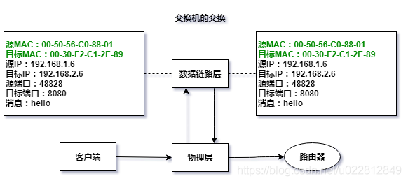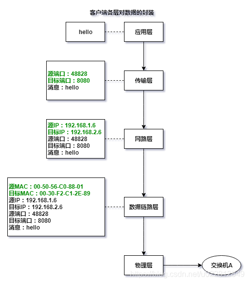 就这样客户端完成了对报文的组装,交给物理层把数据从网卡发送出去,发送到交换机A。