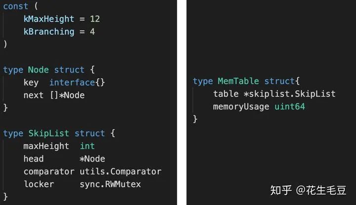 MemTable和SkipList的结构如下代码所示,其中Node的key即LevelDB的数据元素(InternalKey).