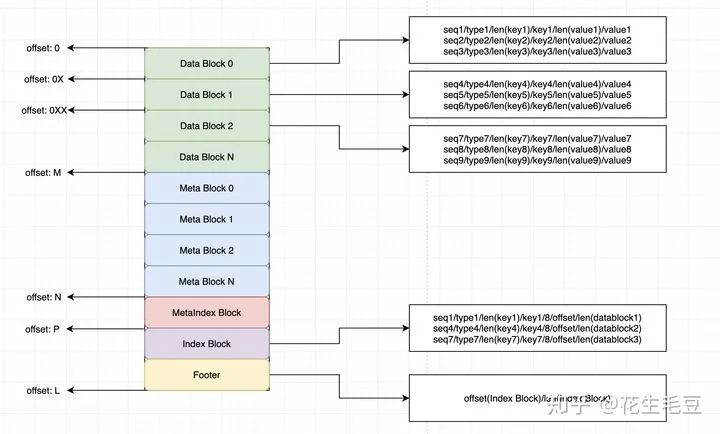 Data Block(s)存储一系列排序的KV值,数据存储内容和格式表示在图中(/是为了分割方便理解,并非真正存在,正在内容就是一堆紧挨着的二进制码) Meta Block(s)存储对应Data Block的过滤信息,如布隆过滤器的值,加速Key的查找 MetaIndex Block存储Meta Block的索引信息 Index Block存储Data Block(s)的索引信息,包含每个Data Block的最小Key和offset以及整个Block的length Footer存储指向MetaIndex、Index Block的索引信息,固定长度