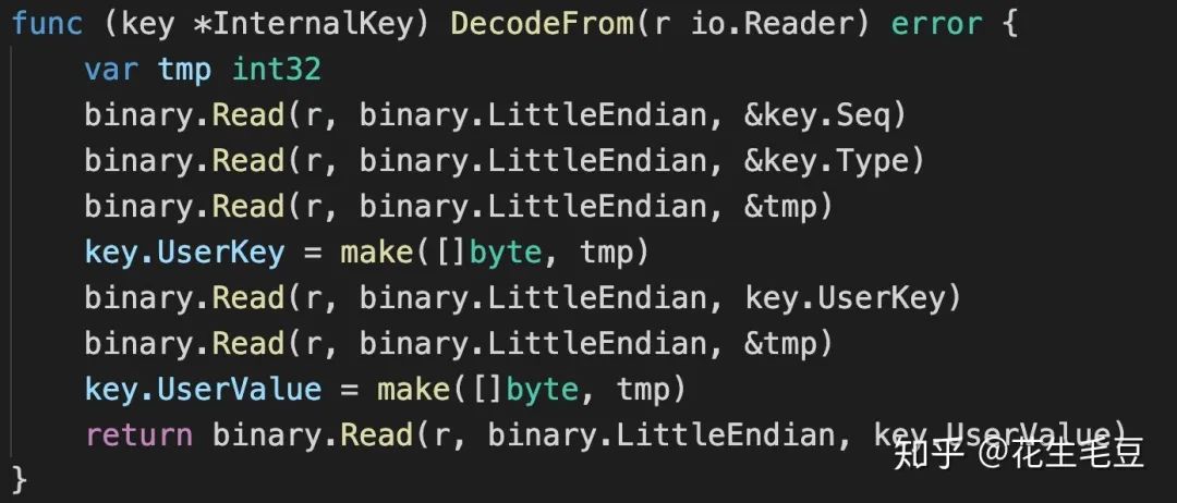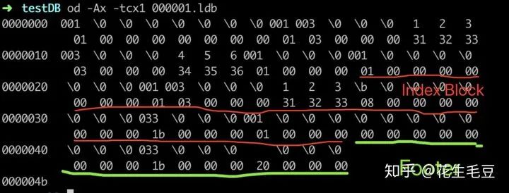 因为忽略MetaIndex的实现,直接将游标设为offset27,并读取后面的32长度,得到红色部分。Block的部分其实就是紧密的写Key,最后写Block中含有多少Key的个数(uint32),因此先读取最后的4位,得到只写了1个key。然后再读取key即可。单个key也是按照写入方式依次读取的,因为seq(uint64),type(int8)是固定长度可以直接读取,而key和value则是用户自定义的不能直接读取,因此先读取一个len(key)和len(value),根据长度再分别读取真正的字符串。所以value为 00 00 00 00 1b 00 00 00