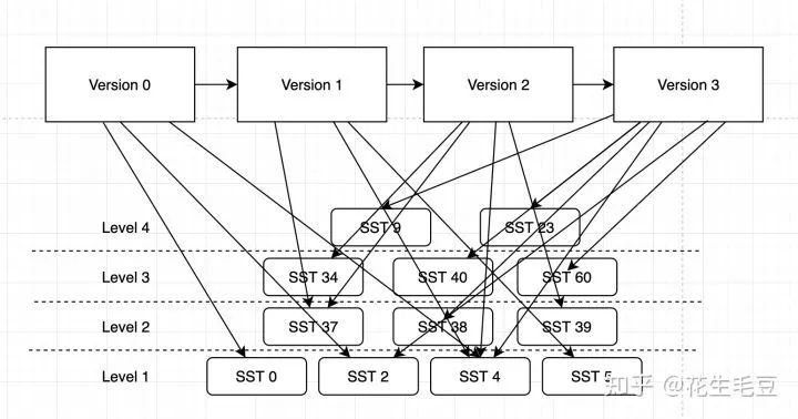 上文讲了SST的单个文件,但没有讲到SST的Level信息。整个DB需要对SST文件进行管理,包括各层级的文件(s)以及升级(聚合、merge、Level上升)等信息,所以有了Version这个模块,Version是一个一步步向前的演进的模块,同时整个DB架构图中的current文件就是指向Manifest,而Manifest存储的就是对应的最新的Version信息。