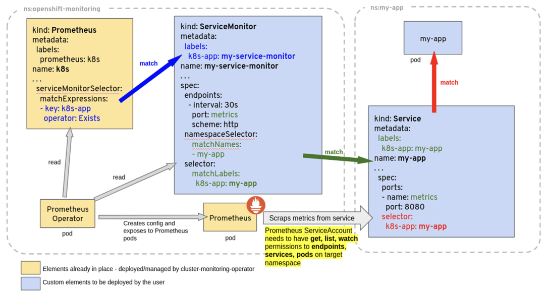 apiVersion: monitoring.coreos.com/v1kind: ServiceMonitormetadata:name: sample-metrics-applabels:service-monitor: sample-metrics-appspec:selector:matchLabels:app: sample-metrics-app # 匹配标签为app:sample-metrics-app的serviceendpoints:- port: web #Promethues采集指标的端口为service中portName表示的端口