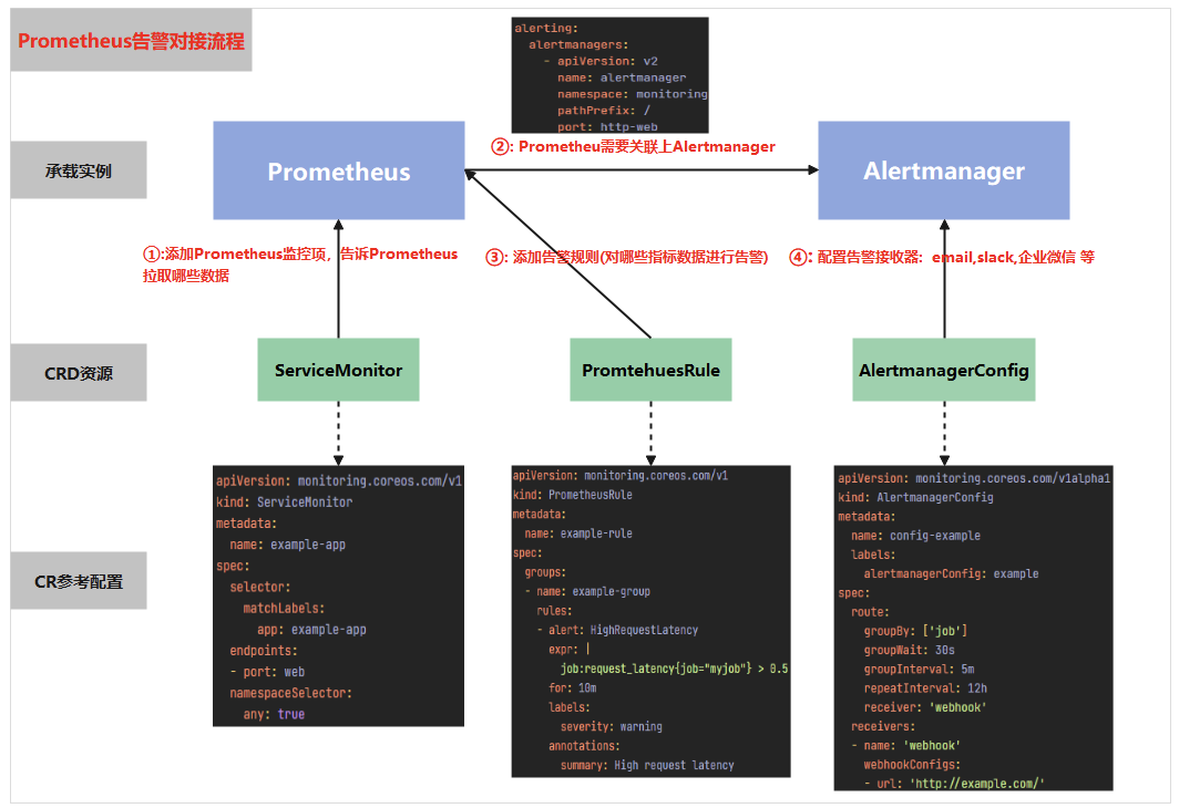 下图很好的展现了prometheus在配置报警时需要操作哪些资源,及各资源起到的作用