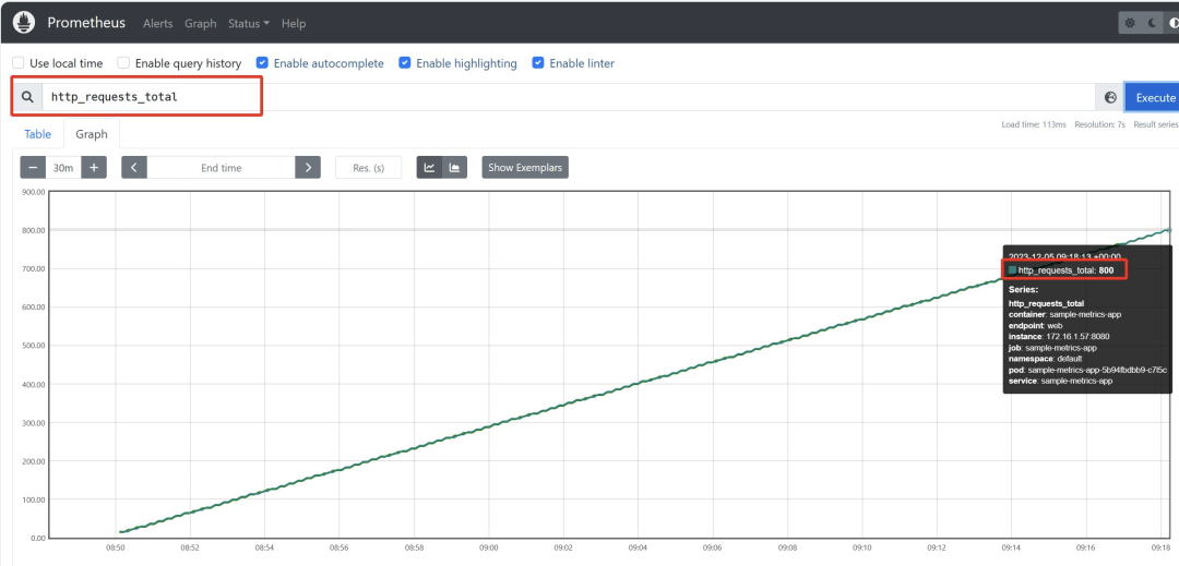 可以看到,应用暴露的指标是 “http_requests_total” ,且监控采集到的数量是805