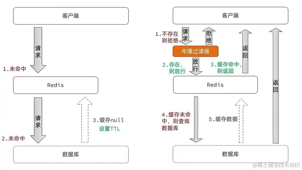 。这样只要用户查询了一次不存在的数据,Redis就会把它缓存起来用来辨别后续大量的恶意请求,完美的解决了缓存穿透的问题。布隆过滤:布隆过滤器其实采用的是哈希思想来解决这个问题,通过一个庞大的二进制数组,走哈希思想去判断当前这个要查询的这个数据是否存在,如果布隆过滤器判断存在,则放行,这个请求会去访问redis,哪怕此时redis中的数据过期了,但是数据库中一定存在这个数据,在数据库中查询出来这个数据后,再将其放入到redis中