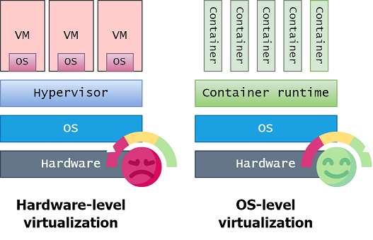 Docker 容器实际上是轻量级 Linux 虚拟机。不同之处在于容器通过容器运行时共享主机操作系统内核和内存,只有应用程序和文件是分开的(操作系统级虚拟化)。容器启动速度更快,需要的资源更少,因此您可以在同一台机器上运行更多。