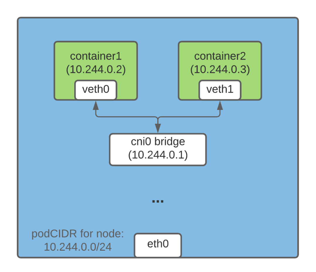 在同一主机上运行的容器通过 IP 地址相互通信的方法之一是使用 Linux Bridge,即在 Kubernetes(和 Docker)世界中,创建 veth(虚拟以太网)设备。该 veth 设备的一端连接在容器网络命名空间,另一端连接到主机网络上的 Linux Bridge。同一主机上的所有容器都将这 veth pair 的一端连接到 Linux Bridge,它们可以通过 Bridge 使用 IP 地址相互通信。Linux Bridge 也被分配了一个 IP 地址,它充当从目的地到不同节点的 Pod 流出流量的网关。