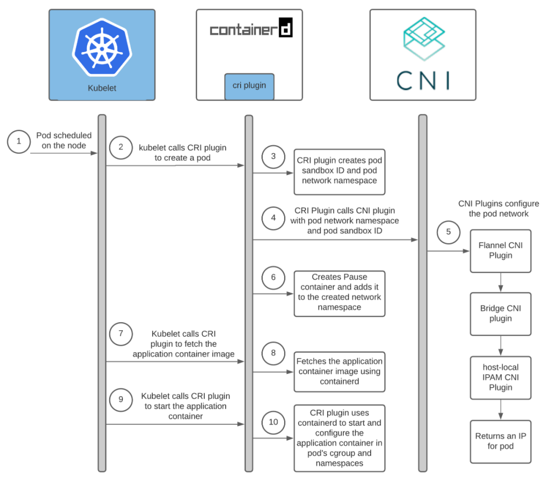 。Flanneld 创建一个 vxlan 设备,从 apiserver 获取网络元数据,并监控 Pod 上的更新。创建 Pod 时,它将在整个集群中为所有 Pod 分配路由,这些路由允许 Pod 通过 IP 地址相互连接。Containerd CRI 插件和 CNI 插件之间的交互可以如下所示:
