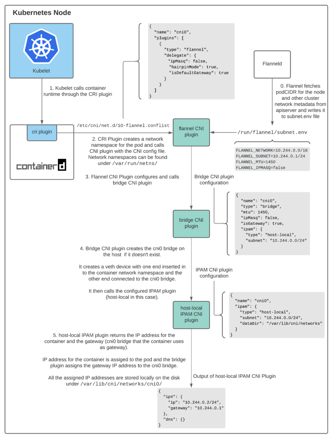 Fannel CNI 插件与 Flanneld 结合使用,当 Flanneld 启动时,它将从 apiserver 中获取 podCIDR 和其他与网络相关的详细信息,并将它们存储在文件中/run/flannel/subnet.env。