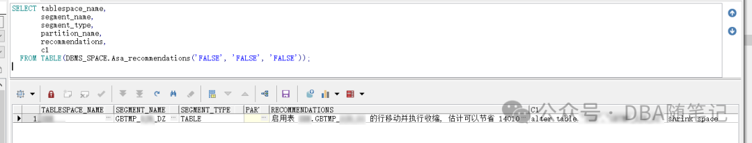 ----查询可以shrink 的对象SELECT f.Impact, O.TYPE, O.Attr1, O.Attr2, f.MESSAGE, f.More_infoFROM dba_advisor_findings f, dba_advisor_objects oWHERE f.object_id = o.object_idAND f.Task_name = o.Task_nameAND f.MESSAGE LIKE '%shrink%'ORDER BY f.Impact DESC;-- Automate Segment Advisor 的 Recommendations 结果SELECT tablespace_name,segment_name,segment_type,partition_name,recommendations,c1FROM TABLE(DBMS_SPACE.Asa_recommendations('FALSE', 'FALSE', 'FALSE'));--上述脚本不仅告诉客户哪些表、索引存在碎片,而且还预估能回收多少空间, 甚至还将产生推荐的空间回收语句,--例如 alter table” ST” .” ORDER” modify partition "ORDER_P2" shrink space.--根据 Auatomatic Segment Advisor 工具的分析结果综合评估,确定需要进行碎片整理的表、索引等对象清单和实施策略。
