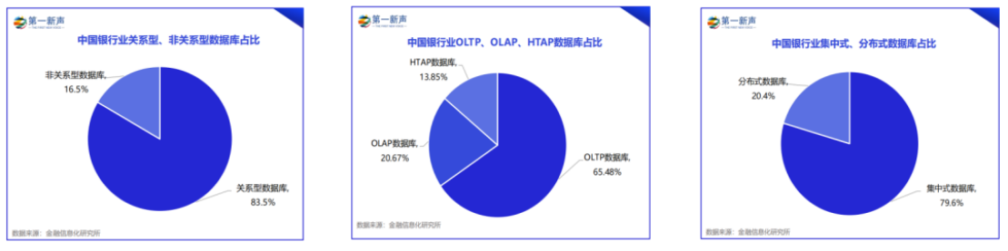 11月20日,国内知名专业媒体“第一新声”发布《2024中国银行业数据库市场研究报告》。报告指出,银行业占据金融整体数据库市场规模近80%的份额,预计2024年中国银行业数据库市场规模达到35.8亿元。其中,关系型数据库占比83.5%;OLTP数据库占比约65.48%,OLAP占比20.67%,HTAP占比13.85%;集中式数据库占比近80%,分布式约20%。