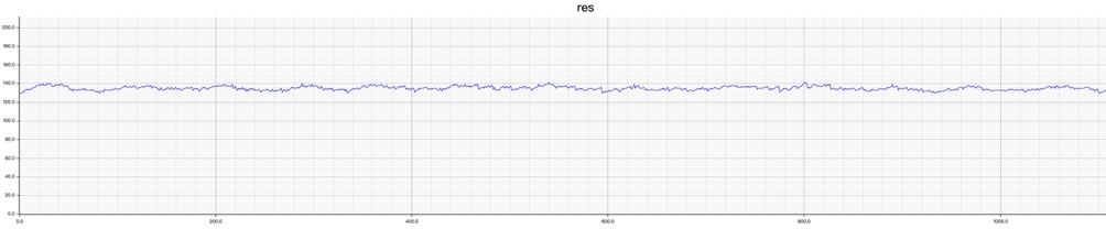 在每秒 70w 点的写入负载下,我们采集了 GreptimeDB Edge 在 30 分钟内的性能数据。GreptimeDB Edge 的 CPU 使用率平均 单核 5.7%,峰值未超过 **15%。在内存使用方面,GreptimeDB Edge 的常驻内存大小(Resident Memory Size)在 130 MB 至 150 MB 之间波动,平均为 135 MB。具体数据如下所示,供大家参考: