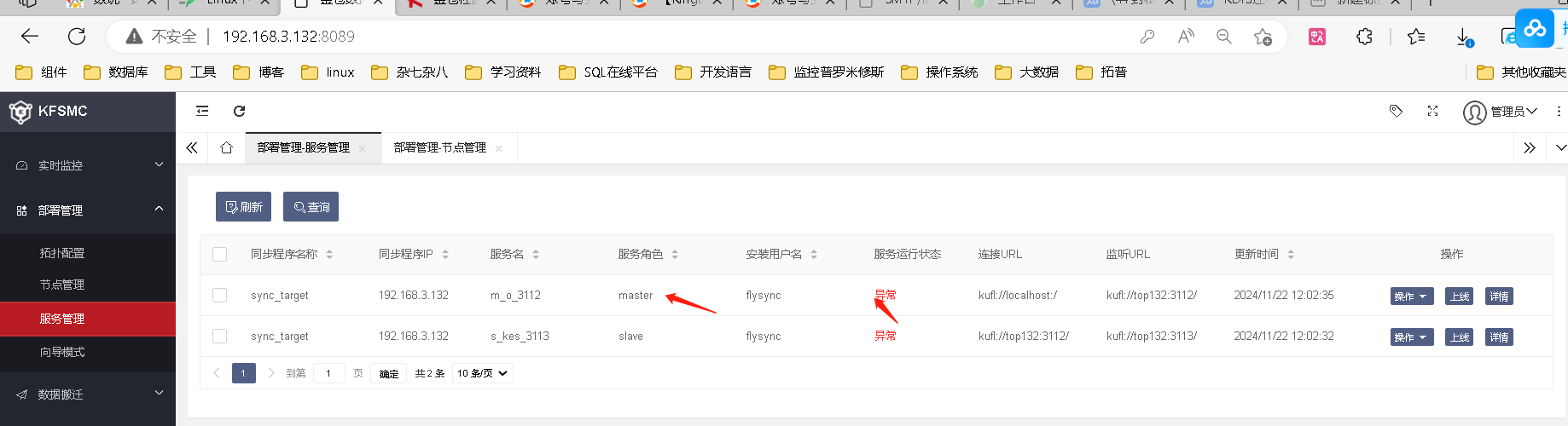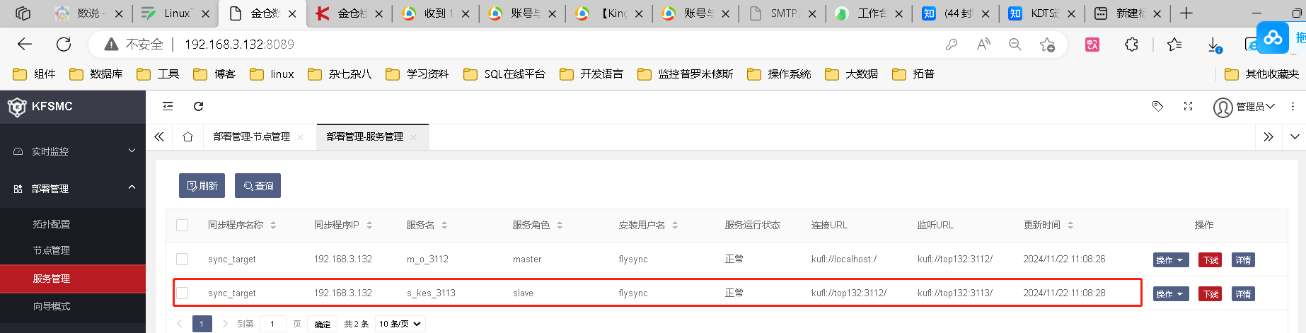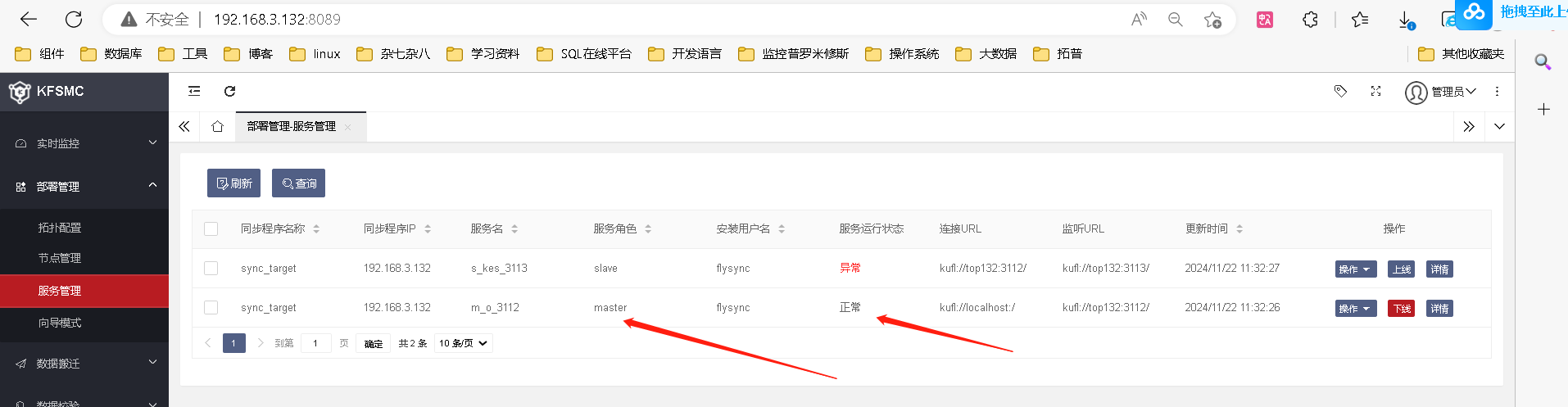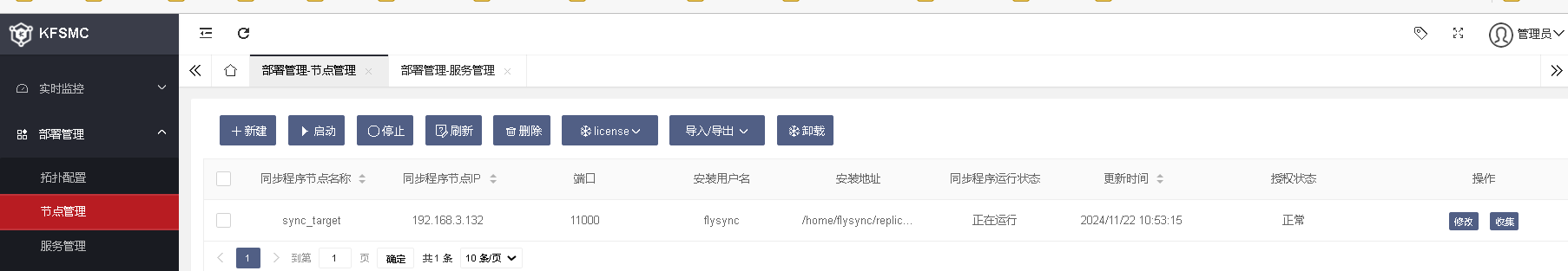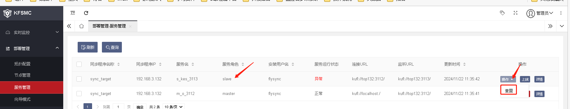 KFS的同步服务(即service)分两种角色,一种是master角色(负责解析增量数据),一种是slave角色(负责接收指定master解析的增量数据并加载到目标端数据库),一个slave服务只能指定接受一个master服务解析的增量数据;一个服务有且只能具有一个角色,因此实现端到端的增量数据同步,至少需要部署两个服务(一个master角色和一个slave角色的服务)。