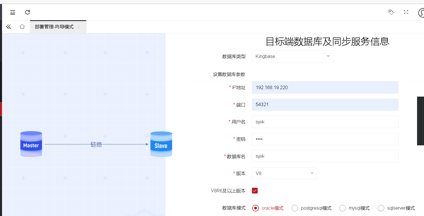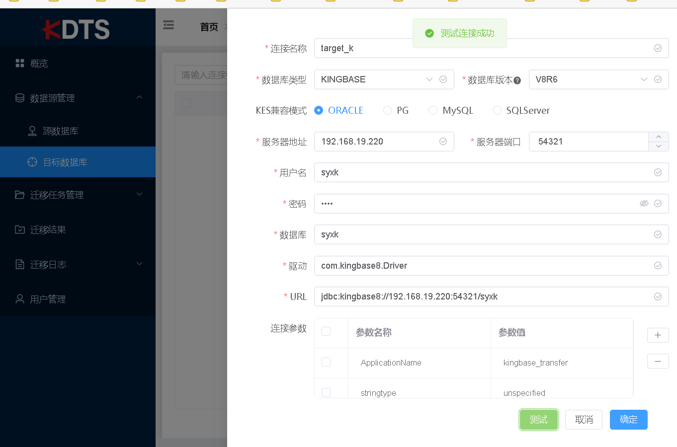 目标端 | KingbaseV8R6单点 | 192.168.19.220 | 端口54321 | 用户密码:syxk/syxk |