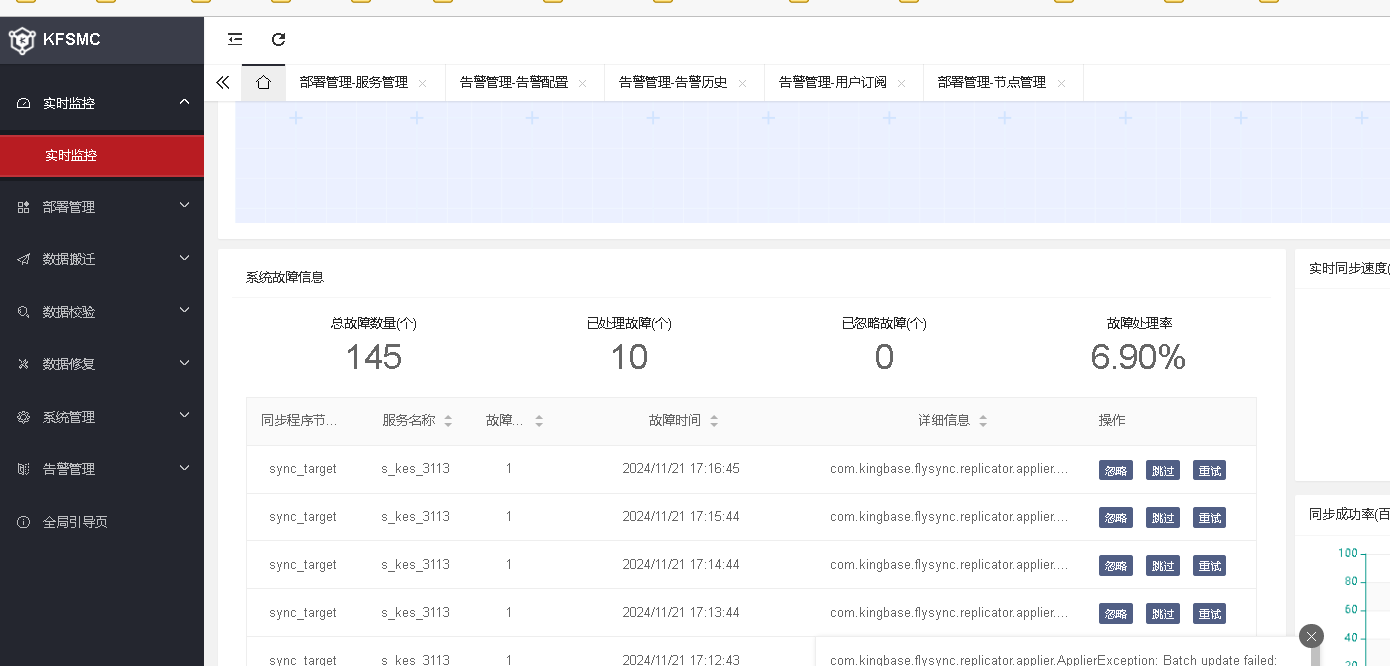 系统故障信息报错的全部信息还是要去日志里确认,日志位置:安装目录/flysync/flysync-replicator/log下的fsrepsvc.log文件