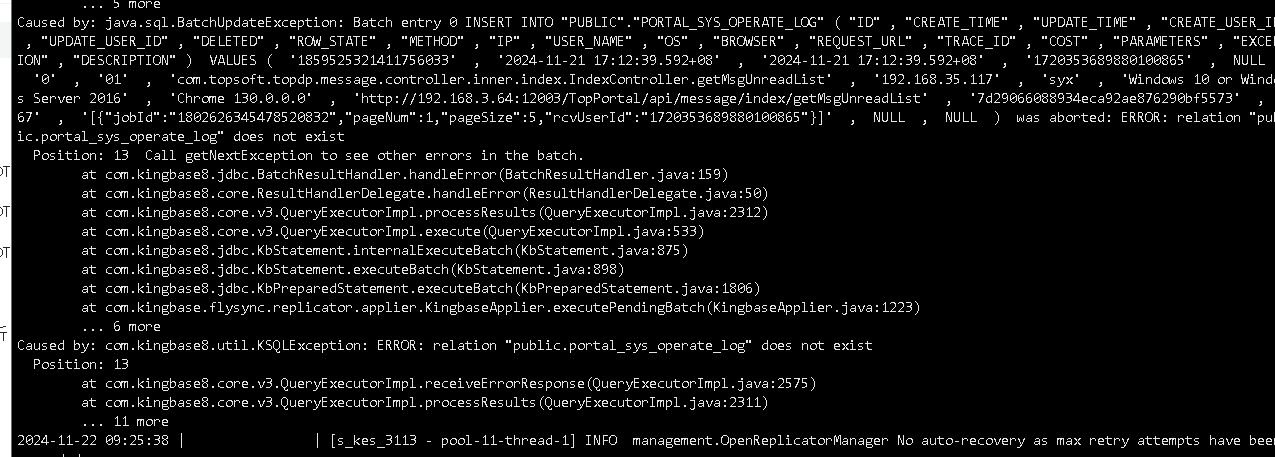 Caused by: com.kingbase.flysync.replicator.applier.ApplierException: Batch update failed: statement=INSERT INTO "PUBLIC"."AUTH_LOG" ( "ID" , "CREATE_TIME" , "UPDATE_TIME" , "CREATE_USER_ID" , "UPDATE_USER_ID" , "DELETED" , "ROW_STATE" , "USER_NAME" , "TYPE" , "RESULT" , "EXCEPTION" , "IP" , "OS" , "BROWSER" , "REQUEST_URL" , "DESCRIPTION" ) VALUES ( ? , ? , ? , ? , ? , ? , ? , ? , ? , ? , ? , ? , ? , ? , ? , ? )