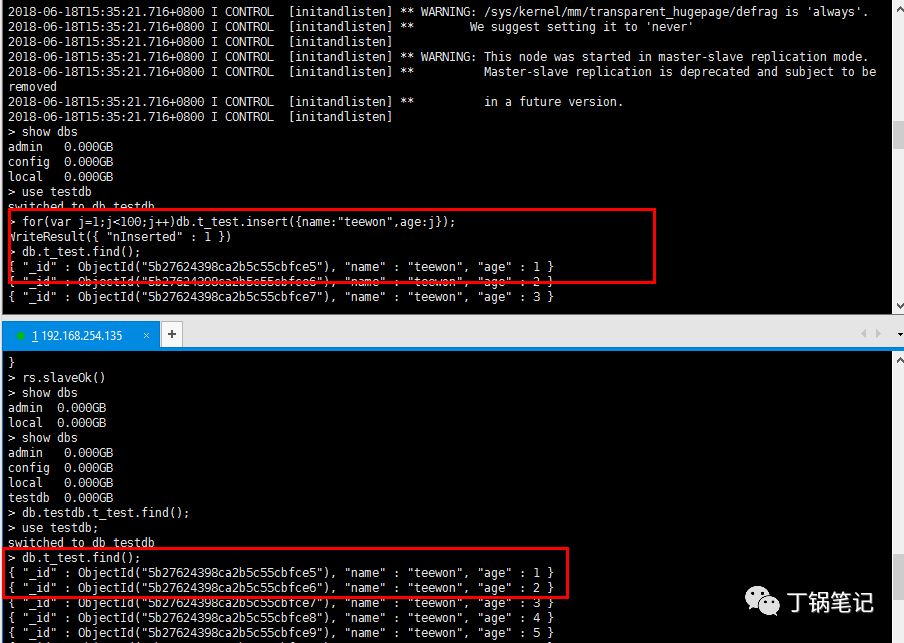 注意:从机不能读也不能写。从机若要可以读数据,可以在连接从机上输入修改:rs.slaveOk();