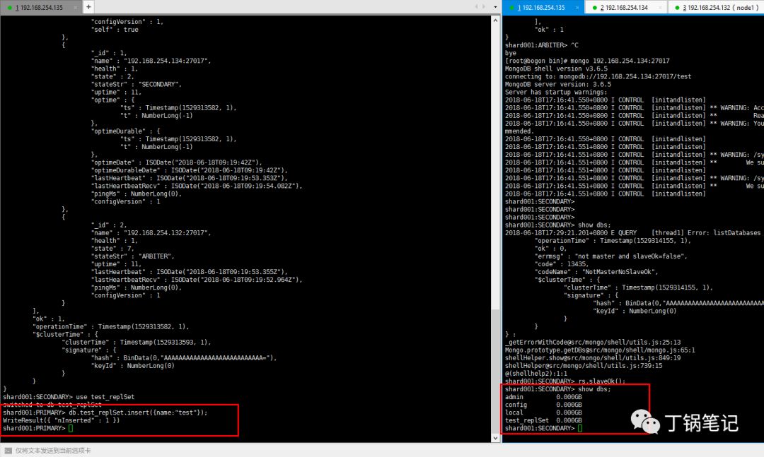>mongo 192.168.254.135:27017 #ip 和 port 是某个节点的地址