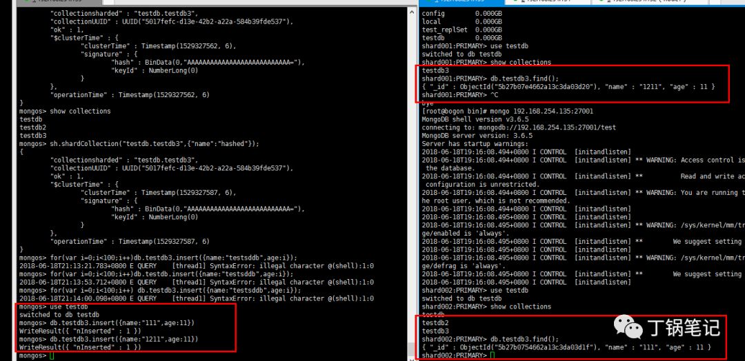 >for(var i=0;i<100;i++)db.testdb.insert({name:"testdb",age:i});#插入数据,分片到不同的副本集。如上图所示。