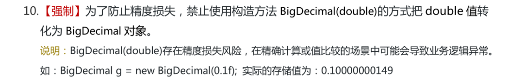 直接将Double转化为BigDecimal存在精度损失风险,特别是在精确计算场景中,解决方案在此手册上也给出了两种方法: