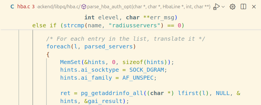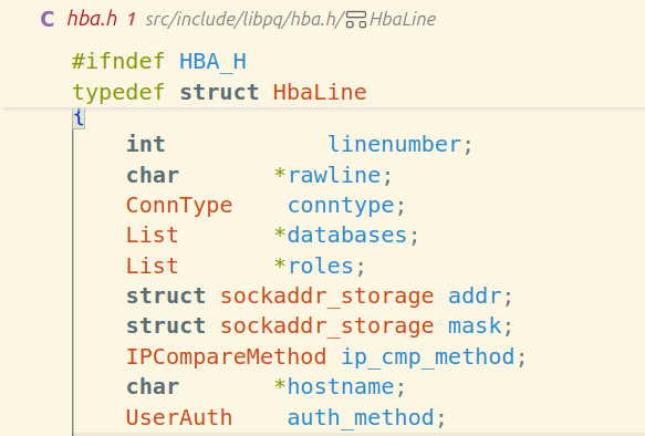 hba.c中,List 便被应用于存储解析后的 hba 配置文件代码,参考下面的内容: