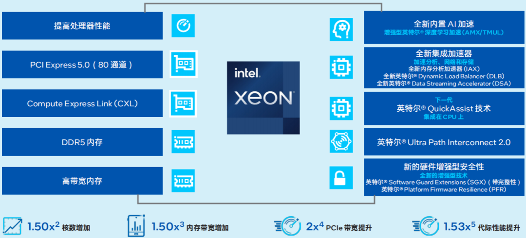 第四代英特尔® 至强® 可扩展处理器通过创新架构增加了每个时钟周期的指令,每个插槽多达60个核心,支持8通道DDR5内存,有效提升了内存带宽与速度,并通过PCIe 5.0(80个通道)实现了更高的PCIe带宽提升。第四代英特尔® 至强® 可扩展处理器提供了现代性能和安全性,可根据用户的业务需求进行扩展。借助内置的加速器,用户可以在AI、分析、云和微服务、网络、数据库、存储等类型的工作负载中获得优化的性能。通过与强大的生态系统相结合,第四代英特尔® 至强® 可扩展处理器能够帮助用户构建更加高效、安全的基础设施。
