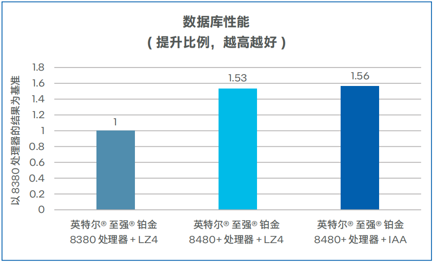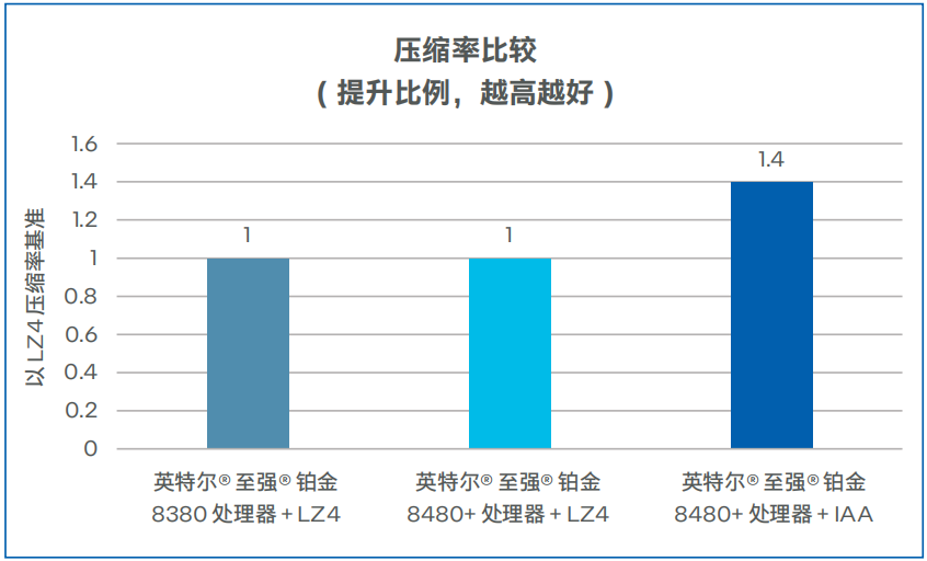 • 英特尔® IAA压缩算法的压缩率达到传统压缩算法的1.4倍,为用户节省了大量的硬盘空间,降低成本;结合CPU的迭代,性能提升可达到原配置的1.56倍,有助于客户化解数据压缩所带来的性能困扰9 。