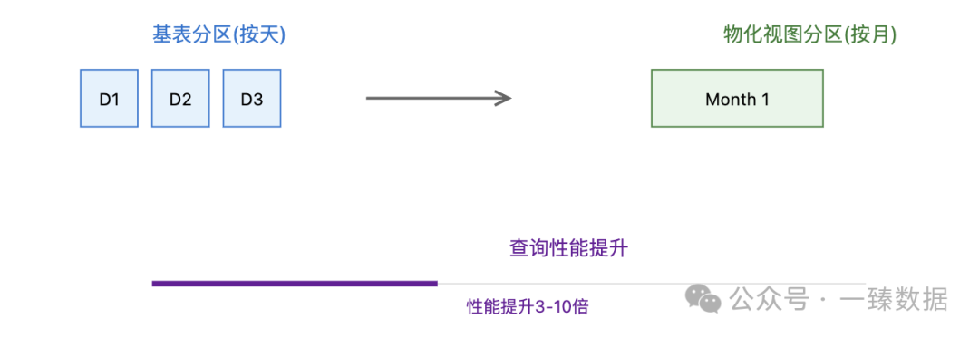 分区上卷更是一个令人眼前一亮的特性。它能够将基表的细粒度分区智能合并成粗粒度分区:基表按天分区,而分析需求常常是按月度统计,这时分区上卷就能自动将30个日分区合并成1个月分区,大大减少分区数量。如下示例: