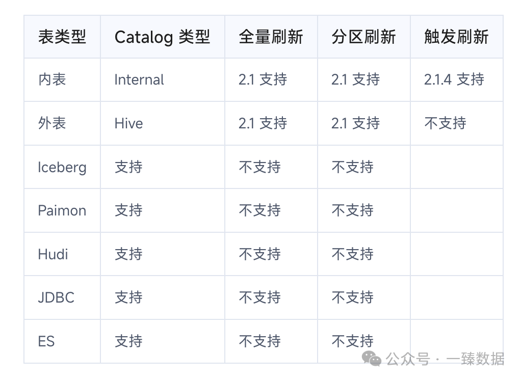 物化视图支持不同刷新策略,如定时刷新和手动刷新,也支持不同的刷新粒度,如全量刷新、分区粒度的增量刷新等。