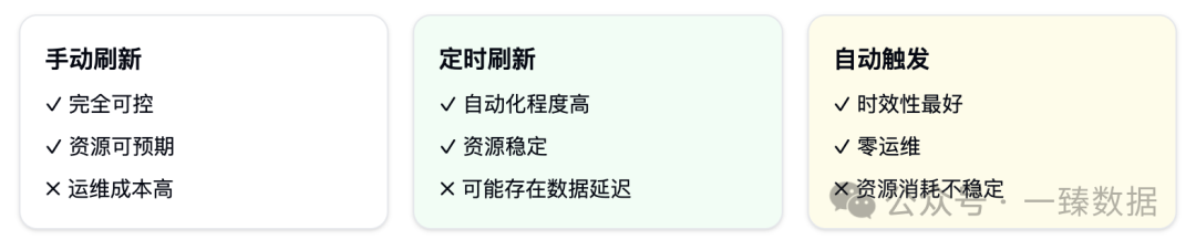 其次是刷新策略。根据数据更新频率和时效性要求,选择合适的刷新方式。对于准实时分析场景,可以设置较小的刷新间隔;对于T+1报表场景,则可以选择在业务低峰期进行批量刷新。新版本还支持数据变更自动触发刷新,进一步降低运维成本。