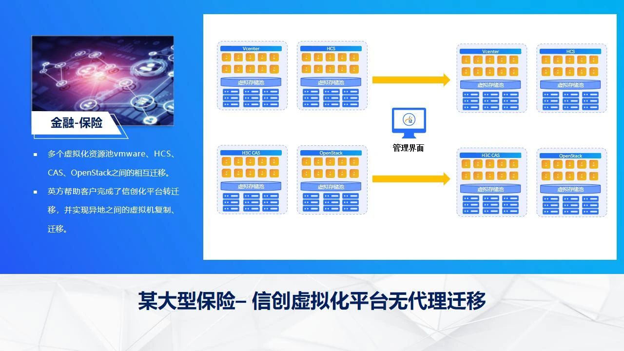 某大型保险企业成功实施了从多源虚拟化资源池(包括VMware、HCS、CAS及OpenStack等)向信创虚拟化平台的全面无代理迁移。在确保业务不间断运行的同时,实现了数据的无缝迁移与复制,有效避免了传统迁移方法可能带来的复杂性与风险。迁移过程中,无代理方案减少了对原系统的干扰,提升了迁移效率与成功率,确保了迁移过程的高效与安全。此外,项目还增强了该保险公司在异地的虚拟机复制与迁移能力,构建了自主可控的容灾体系,进一步提升了业务连续性与数据安全性。