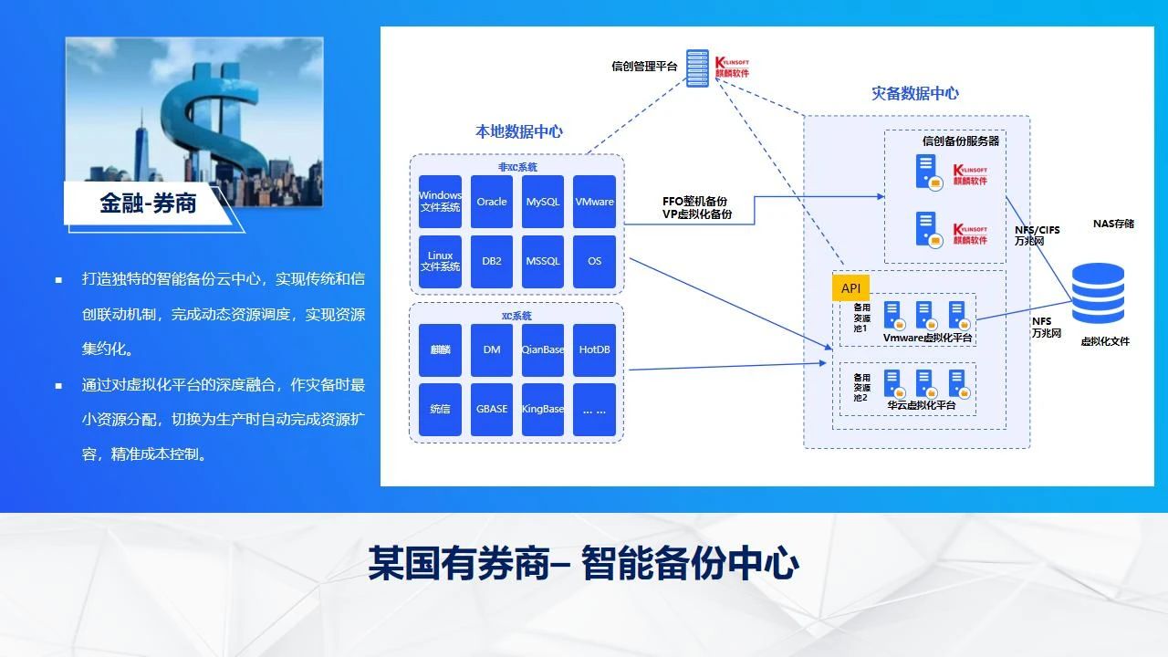某国有券商开展了智能备份中心建设,不仅实现了传统备份体系与信创技术的深度融合联动,构建起跨平台的灵活备份与恢复机制,还通过前沿的动态资源调度技术,实现了资源的最优化配置与集约化管理。在虚拟化平台层面,该智能备份云中心展现出卓越的深度融合能力,能够在灾备模式下精准控制资源分配,确保最小资源占用,并有效降低了运营成本。当需要切换至生产模式时,系统能够自动完成资源的快速扩容,确保业务的无缝衔接与高效运行。