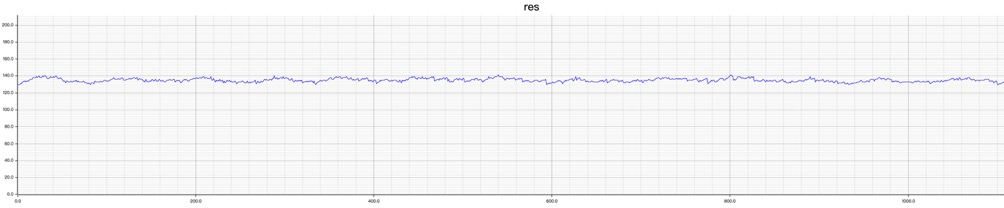 在每秒 70w 点的写入负载下,我们采集了 GreptimeDB Edge 在 30 分钟内的性能数据。GreptimeDB Edge 的 CPU 使用率平均 单核 5.7%,峰值未超过 15%。在内存使用方面,GreptimeDB Edge 的常驻内存大小(Resident Memory Size)在 130 MB 至 150 MB 之间波动,平均为 135 MB。具体数据如下所示,供大家参考:
