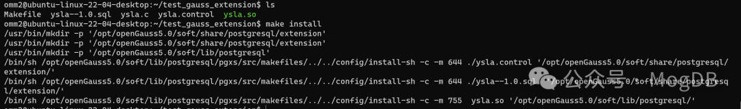 omm2@ubuntu-linux-22-04-desktop:~/test_gauss_extension$ lsMakefile ysla--1.0.sql ysla.c ysla.control ysla.soomm2@ubuntu-linux-22-04-desktop:~/test_gauss_extension$ make install/usr/bin/mkdir -p '/opt/openGauss5.0/soft/share/postgresql/extension'/usr/bin/mkdir -p '/opt/openGauss5.0/soft/share/postgresql/extension'/usr/bin/mkdir -p '/opt/openGauss5.0/soft/lib/postgresql'/bin/sh opt/openGauss5.0/soft/lib/postgresql/pgxs/src/makefiles/../../config/install-sh -c -m 644 ./ysla.control '/opt/openGauss5.0/soft/share/postgresql/extension/'/bin/sh opt/openGauss5.0/soft/lib/postgresql/pgxs/src/makefiles/../../config/install-sh -c -m 644 ./ysla--1.0.sql '/opt/openGauss5.0/soft/share/postgresql/extension/'/bin/sh /opt/openGauss5.0/soft/lib/postgresql/pgxs/src/makefiles/../../config/install-sh -c -m 755 ysla.so '/opt/openGauss5.0/soft/lib/postgresql/'