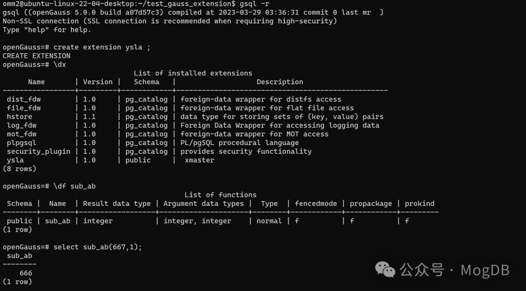 omm2@ubuntu-linux-22-04-desktop:~/test_gauss_extension$ gsql -rgsql ((openGauss 5.0.0 build a07d57c3) compiled at 2023-03-29 03:36:31 commit 0 last mr )Non-SSL connection (SSL connection is recommended when requiring high-security)Type "help" for help.openGauss=# create extension ysla ;CREATE EXTENSIONopenGauss=# \dxList of installed extensionsName | Version | Schema | Description-----------------+---------+------------+--------------------------------------------------dist_fdw | 1.0 | pg_catalog | foreign-data wrapper for distfs accessfile_fdw | 1.0 | pg_catalog | foreign-data wrapper for flat file accesshstore | 1.1 | pg_catalog | data type for storing sets of (key, value) pairslog_fdw | 1.0 | pg_catalog | Foreign Data Wrapper for accessing logging datamot_fdw | 1.0 | pg_catalog | foreign-data wrapper for MOT accessplpgsql | 1.0 | pg_catalog | PL/pgSQL procedural languagesecurity_plugin | 1.0 | pg_catalog | provides security functionalityysla | 1.0 | public | xmaster(8 rows)openGauss=# \df sub_abList of functionsSchema | Name | Result data type | Argument data types | Type | fencedmode | propackage | prokind--------+--------+------------------+---------------------+--------+------------+------------+---------public | sub_ab | integer | integer, integer | normal | f | f | f(1 row)openGauss=# select sub_ab(667,1);sub_ab--------666(1 row)