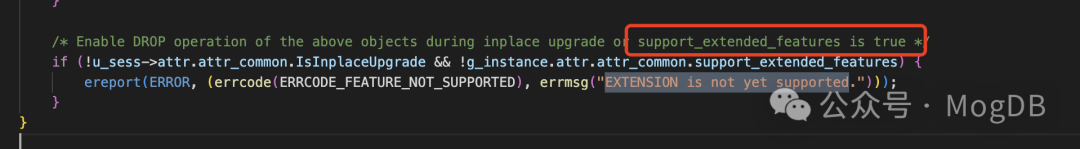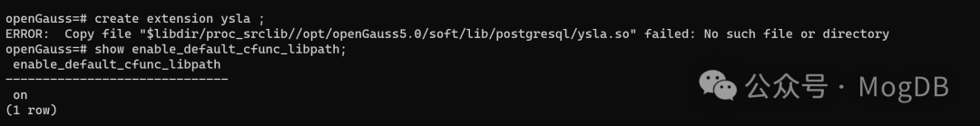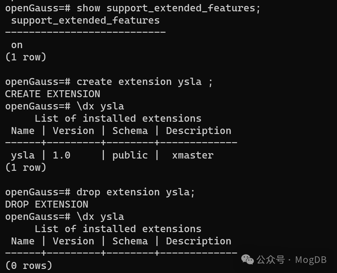 openGauss=# show support_extended_features;support_extended_features---------------------------on(1 row)openGauss=# create extension ysla ;CREATE EXTENSIONopenGauss=# \dx yslaList of installed extensionsName | Version | Schema | Description------+---------+--------+-------------ysla | 1.0 | public | xmaster(1 row)openGauss=# drop extension ysla;DROP EXTENSIONopenGauss=# \dx yslaList of installed extensionsName | Version | Schema | Description------+---------+--------+-------------(0 rows)