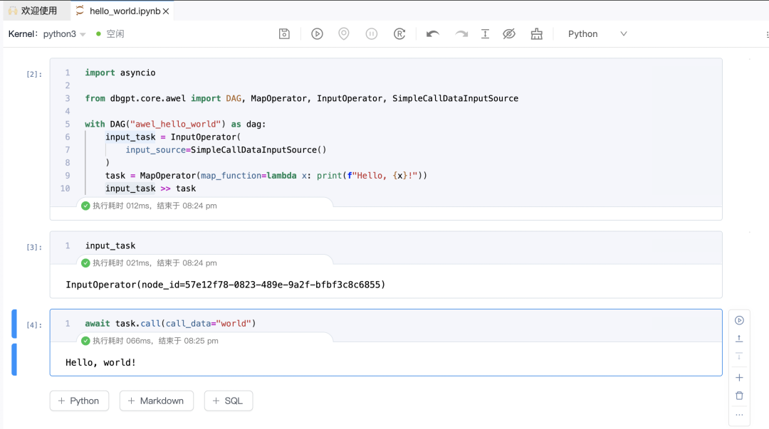 import asynciofrom dbgpt.core.awel import DAG, MapOperatorwith DAG("awel_hello_world") as dag:task = MapOperator(map_function=lambda x: print(f"Hello, {x}!"))await task.call(call_data="world")