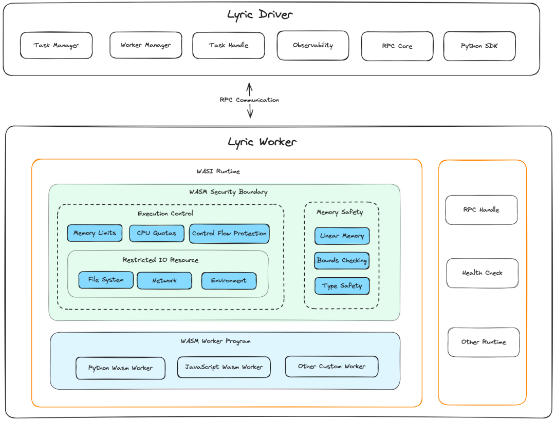 import asynciofrom lyric import DefaultLyricDriverpython_code = """def add(a, b):return a + bresult = add(1, 2)print(result)"""js_code = """console.log('Hello from JavaScript!');"""async def main():lcd = DefaultLyricDriver(host="localhost", log_level="ERROR")lcd.start()# Load workers(default: Python, JavaScript)await lcd.lyric.load_default_workers()# Execute Python codepy_res = await lcd.exec(python_code, "python")print(py_res)# Execute JavaScript codejs_res = await lcd.exec(js_code, "javascript")print(js_res)# Stop the driverlcd.stop()asyncio.run(main())