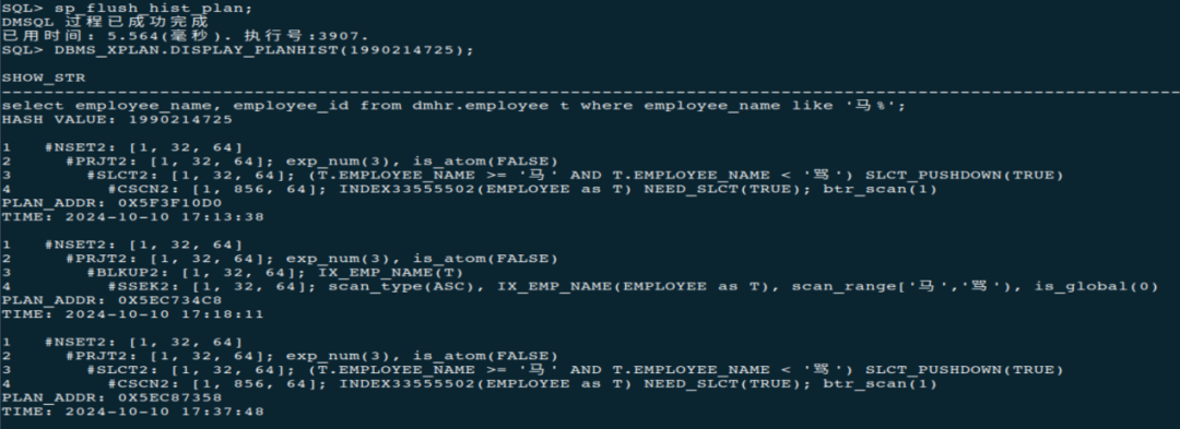 SQL> drop index dmhr.ix_emp_name;SQL> select employee_name, employee_id from dmhr.employee t where employee_name like '马%';SQL> sp_flush_hist_plan;SQL> DBMS_XPLAN.DISPLAY_PLANHIST(1990214725);