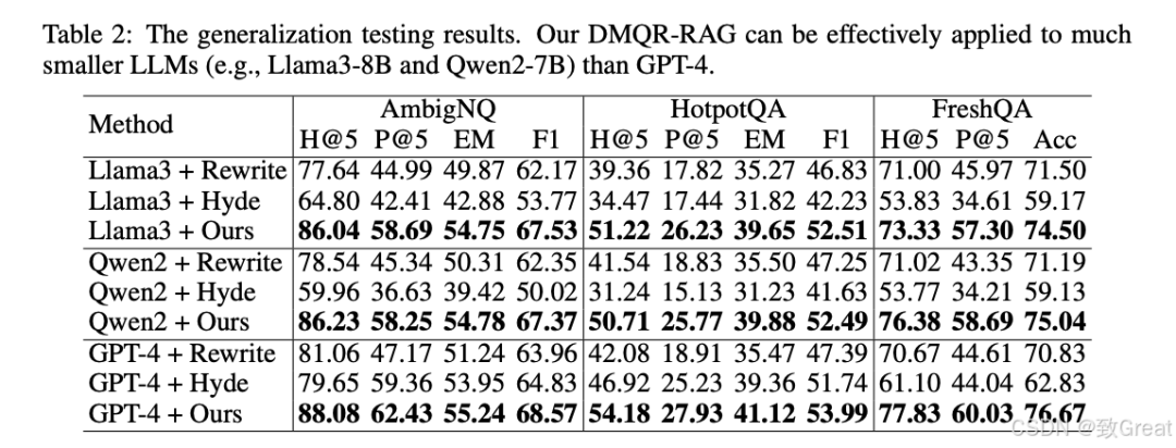 原始查询的重要性:原始查询(OQR)在某些场景下可以准确表达用户意图,并提供有助于文档检索和端到端响应的上下文。这表明,将原始查询与其重写版本结合在检索策略中是合理且有效的。 多重查询重写的优势:相比单一查询重写,多重查询重写表现更优。在文档检索任务中,DMQR-RAG方法在所有数据集上的表现均优于现有的重写方法。例如,在FreshQA数据集上,DMQR-RAG相较于最佳基线的P@5提升了14.46%。 在复杂问题上的表现:在HotpotQA这样的复杂多跳问题中,DMQR-RAG显著提高了检索性能,P@5提升约8%,说明该方法适用于多种类型的查询,具有较强的通用性。 端到端响应性能:在端到端响应任务中,DMQR-RAG超越了最佳基线方法Hyde。在AmbigNQ数据集上,EM和F1分别提高了1.30%和3.74%;在FreshQA数据集上,准确率比Rewrite提升了5.84%。这表明,DMQR-RAG的检索结果能够为响应模型提供准确的外部知识,从而显著提升响应性能。 与RQRAG的比较:尽管RQRAG针对复杂多跳问题进行了专门设计,并在HotpotQA上取得最佳效果,但DMQR-RAG在各类查询中仍表现出色,展现了良好的通用性。 与RAG-Fusion的比较:DMQR-RAG整体优于RAG-Fusion,尤其在AmbigNQ数据集上,P@5提升约10%。此外,通过自适应的重写选择机制,DMQR-RAG在更具挑战性的场景下进一步展现了其优越性。