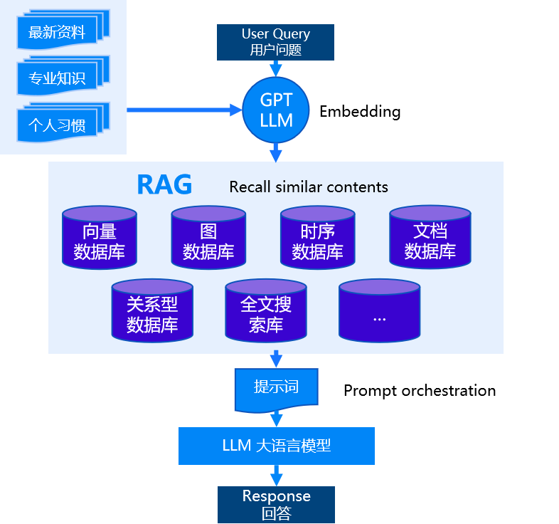 在大模型场景下,基于原生多模统一架构,可以满足大模型场景下多模态数据的统一存储管理与服务,大幅简化知识库的知识存储与服务层架构,降低开发与运维成本。通过将其作为大模型外置知识库,可以检索文本/图片/音视频转化后的向量数据、图数据、时序数据、以及传统关系型数据等,不仅可以解决大模型在领域知识缺乏、知识时效性低等问题,大幅提升大模型的准确率,也可以基于多模型数据探索和应用更多的业务场景。