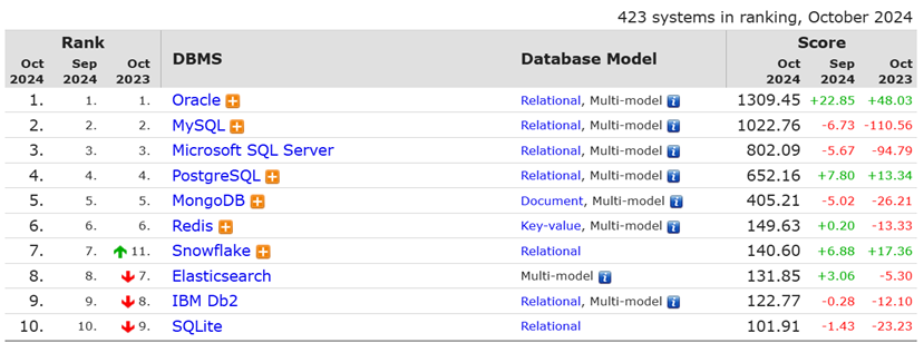 Gartner近几年发布的《Hyper Cycle for Data Management》报告中,多模数据库在2020年时还是在泡沫化的底谷期,2022年进入到实质生产的高峰期,2023年已经成为技术成熟度曲线靠右第二的技术了,而2024年已经不再出现了该曲线上,说明该技术早已成熟,并被市场接受和应用。从数据库流行度排行榜DB-engines上可以看出,流行度排名前10的产品有8个均支持多模能力。