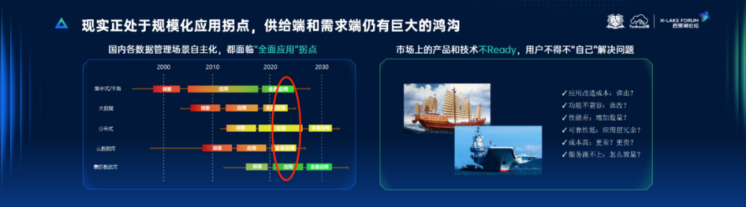 然而,现实情况是用户的诉求与市场目前所提供的产品技术能力有明显差距,在应用场景、数据处理与业务模型、商业与开源生态系统,以及性能、兼容性、核心集群技术、成本和长期发展等各个维度均有体现。就像图中所示,用户可能需要的是一艘现代化军舰,而现在市场上的技术可能还是上个时代木质帆船,能解决一些问题,但大量问题还需要用户自行解决。相对而言,大规模的金融、政企客户有实力去解决,而中国超五千个金融机构不可能都以如此高成本、高投入的方式进行规模化国产替代,该如何解决?面对这一挑战,崖山数据库立足于解决全行业在大规模应用面临的时间、资源和投入问题。